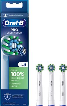Oral-B Pro Cross Action-borsthuvudet har mer än 2 200 perfekt vinklade borststrån för att avlägsna upp till 100 % mer bakteriell plack för renare tänder och hälsosammare tandkött jämfört med en manuell tandborste. Oral-B borsthuvuden är utformade med nya X-formade borststrån som rengör i områden där rundade borststrån inte når. Indikatorn för användning av borsthuvudet gör att borststråna ändrar färg från grönt till gult för att visa när det är dags att byta borsthuvud för 100 % rengöringseffekt. Garanterad passform med Oral-B laddningsbara eltandborstar förutom Pulsonic- och iO-tandborstar.