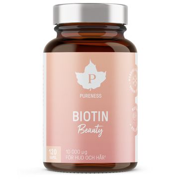 Pureness Biotin är en unik sammansättning av biotin och kollagenpeptider. Biotin, även känt som vitamin B7, är ett viktigt näringsämne som bidrar till att bibehålla normalt hår, hud och naglar. Det stödjer även kroppens energiomsättning genom att hjälpa till att omvandla fett, protein och kolhydrater till energi. Eftersom biotin är vattenlösligt behöver det tillföras regelbundet via kosten eller som kosttillskott. 1 kapsel innehåller hela 10 000 μg Biotin. Precis som alla Pureness kapselprodukter, har den hög absorptionsförmåga och saknar naturligtvis fyllnadsmedel!
