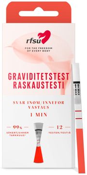 Med RFSU Graviditetstest kan du själv snabbt och enkelt ta reda på om du är gravid. Testet kan tas samma dag som du väntar mens och ger svar redan inom 1 min. Lättanvända teststickor som doppas i behållare med urin. Visar tydligt resultat med ett eller två streck. RFSU Graviditetstest med strips är av samma typ av test som barnmorskor och gynekologer använder. Testets känslighet är 25 mlU/ml av hormonet hCG i urinen. Alla graviditetstester från RFSU är över 99 % tillförlitliga från dagen då du väntar din mens. Du kan testa när som helst under dygnet men säkrast är att mäta morgonurinen, då hCG-koncentrationen är som högst. Förpackningen innehåller 12 st teststickor. Före användning, läs medföljande instruktioner.