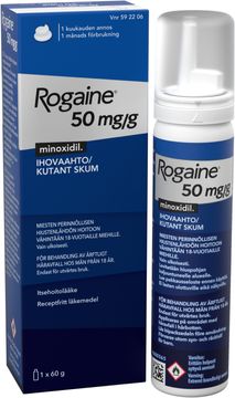 Rogaine® kutant skum 50 mg/g är ett receptfritt läkemedel som används för behandling av ärftligt håravfall hos män från 18 år. Produkten innehåller den aktiva substansen minoxidil som stimulerar håråterväxt och stabiliserar håravfall. Innehåller även glycerol.Rogaine® Skum använder sig av termolabil teknologi som, tillsammans med värmen från hårbotten, gör att skummet snabbt löses upp och absorberas vid applicering.Rogaine® Skum erbjuder ett användarvänligt format som appliceras med fingertopparna. Kan underlätta applicering, framför allt på större behandlingsområden – t.ex. vid håravfall eller tunnhårighet på hjässan.Kan hjälpa till att stoppa ärftligt håravfall och stimulera håråterväxt. Vid applicering av Rogaine® Skum i hårbotten två gånger dagligen kan resultat ses inom 8-16 veckor. Har ett barnskyddande lock.
