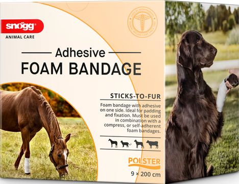 Snögg Animal Foam Bandage Adhesive är ett tvärelastiskt förband som är anpassat för djur med lim på ena sidan och med andra sidan klädd med porös skumplast. Bandaget är mycket bra vidhäftning på päls och hud och är idealisk för att fästa förband eller vid fixering. Ska inte läggas direkt på såret. Vid sårbehandling kan Snögg Animal Foam Bandage Adhesive med fördel användas tillsammans med Snögg Animal Foam Bandage thin eller Thick.Snögg Animal Foam Bandage Adhesive är 9 cm brett och 2 meter långt och kan klippas till önskad längd. Skumplastdynan är 0,5 cm tjockt.