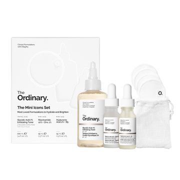 The Mini Icons Set innehåller tre miniformat av några av de mest älskade formuleringarna – perfekta för resor – samt återanvändbara bomullsrondeller för applicering av Glycolic Acid 7% Exfoliating Toner.