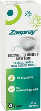 ZASPRAY ögonspray utan konserveringsmedel lindrar, fuktar och smörjer torra ögon vid allergi.Spraya på stängda ögonlock 1 eller 2 gånger per tillfälle, 3-4 gånger om dagen 3-4 dagar i följd. Inte längre än 30 dagar i följd.Ta ut kontaktlinser innan användning. Hållbar 3 månader efter första öppnandet. Medicinteknisk produkt.