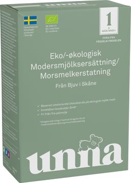 Unna Ekologisk Modersmjölksersättning steg 1 ges som ersättning för eller tillägg till bröstmjölk från första levnadsveckan efter rekommendation av BVC eller barnläkare. Unna steg 1 är en modersmjölksersättning baserad på ekologisk mjölk som tillagas enligt anvisning på förpackningen och täcker näringsbehovet för ditt spädbarn upp till 6 månader. BVC eller barnläkare ska alltid rådfrågas innan användning av modersmjölksersättning. För ditt barns hälsa är det viktigt att noggrant följa tillrednings- och förvaringsanvisningarna på förpackningen.