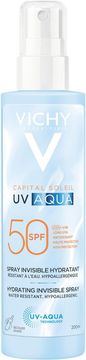 Capital Soleil UV-Aqua Hydrating Invisible Spray är en ultralätt solspray SPF50 för kropp. Absorberas omedelbart utan att kladda eller lämna vita märken. Den ger högt UV-skydd och 24-timmars återfuktning. Osynlig finish på huden och känns inte fet. Innehåller betakaroten som bidrar till att hjälpa fram en strålande solbrun lyster. Skaka före användning.Passar känslig hud. Testad under dermatologisk och oftalmologisk kontroll. Hypoallergen.