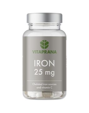 Iron 25 mg från Vitaprana är ett veganskt järntillskott som kombinerar två lättupptagliga former av järn med naturligt vitamin C från bland annat acerolakörsbär för att främja upptaget. Järn är viktigt för normal blodbildning, syretransport i kroppen och hjälper till att minska trötthet och utmattning. Kapslarna är växtbaserade och tillverkade av pullulan.